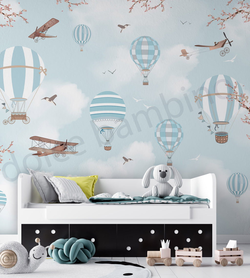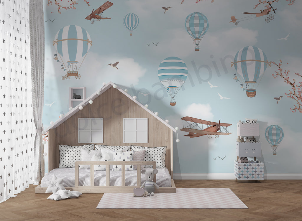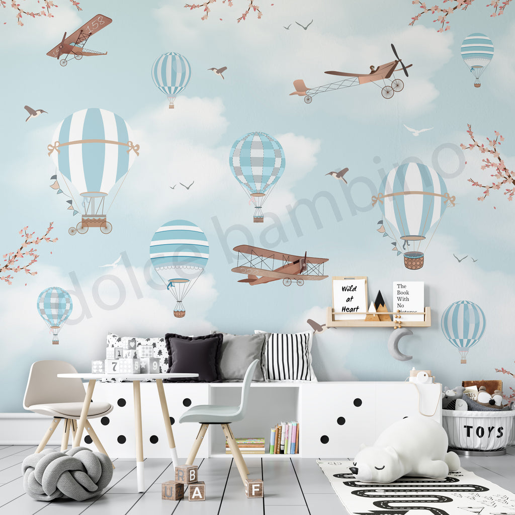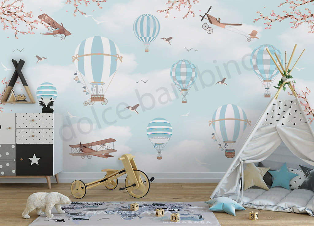 Designed to spark imagination, this dreamy wallpaper features gentle baby-blue skies where charming balloons and nostalgic airplanes glide weightlessly above. Its soft hues and delicate detailing create a serene, storybook atmosphere—ideal for brightening up nurseries, big-kid rooms, or cosy creative nooks.