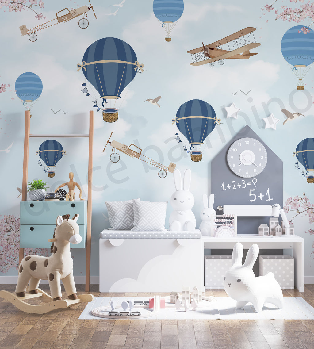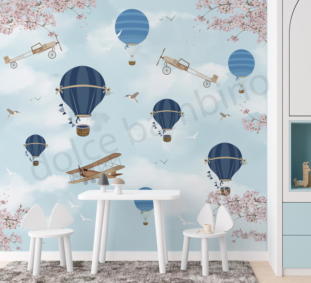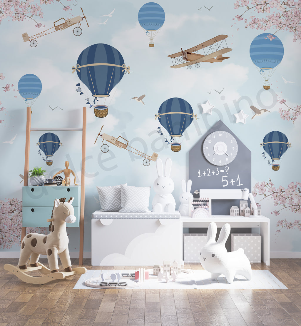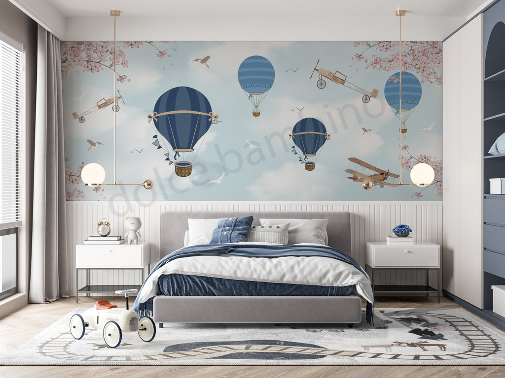 Fly high, dream big, and embark on thrilling journeys within the comfort of one's own space. It’s playful design features hot air balloons and aviator airplanes dancing amidst billowing clouds. Graceful birds soar high through a boundless sky painting them with joy. Gentle cherry blossoms add a touch of charm and ethereal beauty.