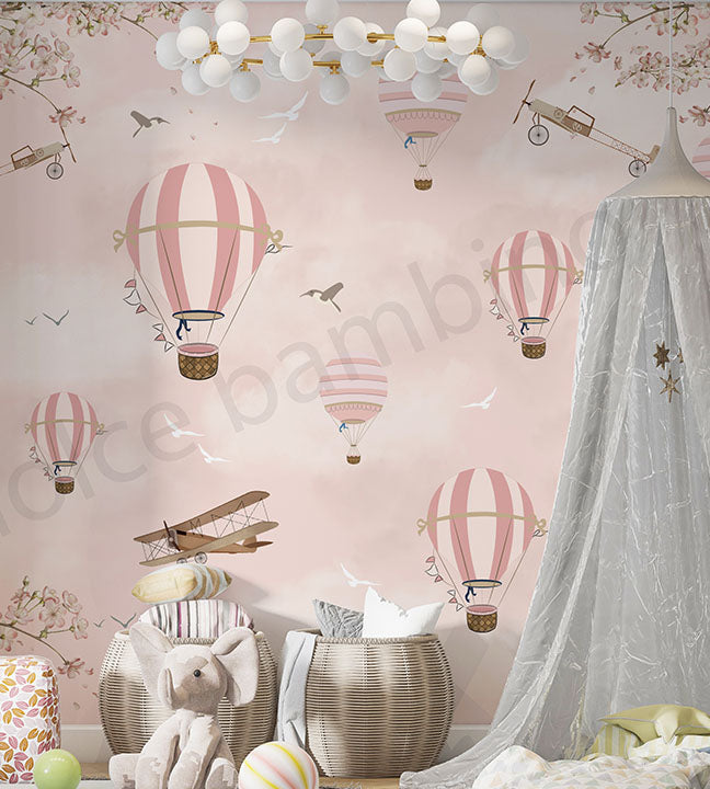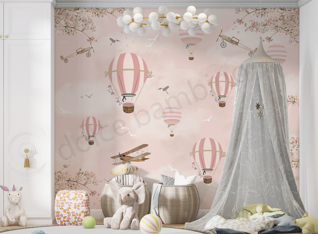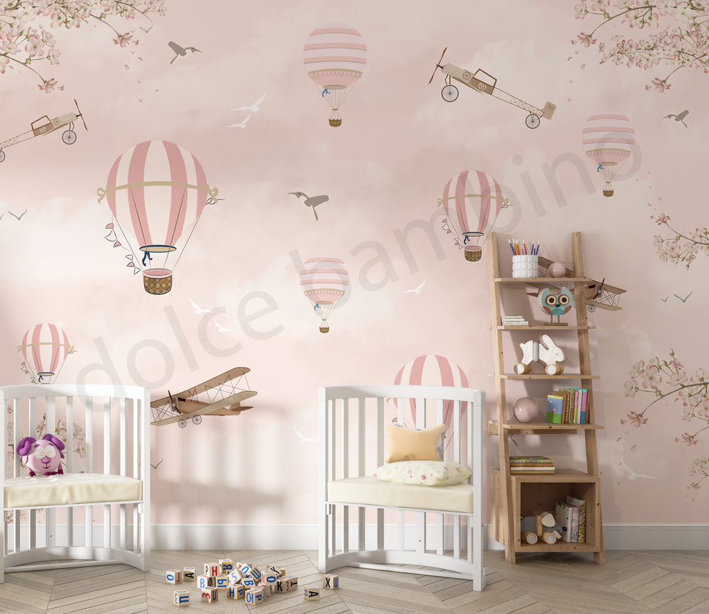 Fly high, dream big, and embark on thrilling journeys within the comfort of one's own space. It’s playful design features hot air balloons and aviator airplanes dancing amidst billowing clouds. Graceful birds soar high through a boundless sky painting them with joy. Gentle cherry blossoms add a touch of charm and ethereal beauty.