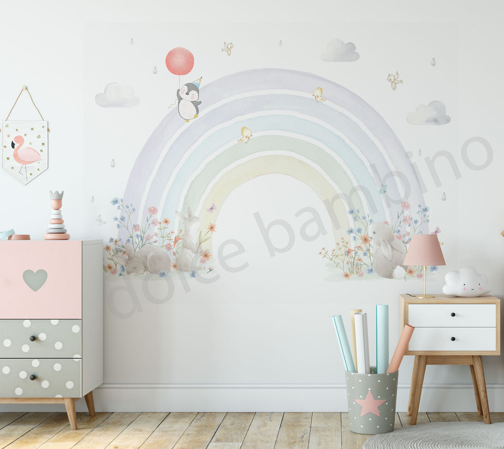 The soft hues and intricate details makes this watercolour mural a visual masterpiece, with a touch of magic and sprinkle of whimsy. Each stroke of the brush captures the vibrant rainbow that stretches its arms across the horizon. Just beneath the arch is a delightful ensemble of bunnies that prance and play, spreading joy with every hop. A lovable penguin, cheerful birds and drifting clouds up in the skies add tranquillity to this enchanting mural.