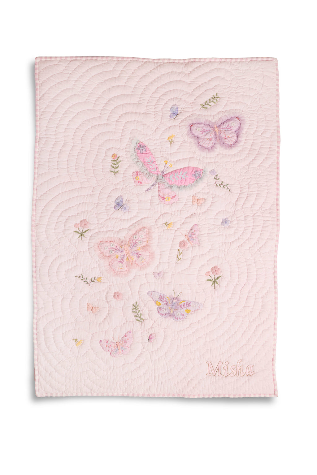 Finished with hand-quilting for a soft hand feel, a checkered quilted back, and blanket stitching around the edges, this piece is as durable as it is delightful.