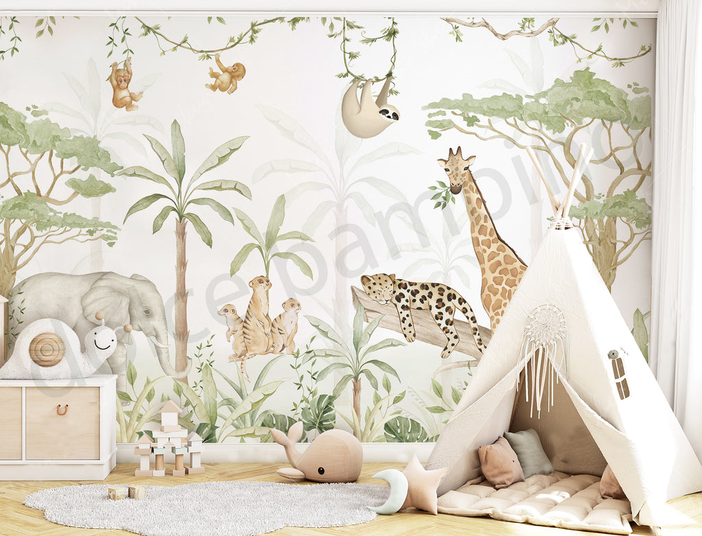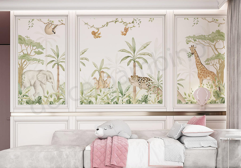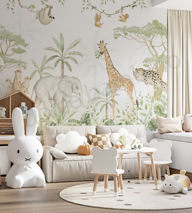 A delightful cast of characters amongst lush grasslands brings you into the heart of the African savannah. From majestic giraffes, to a playful zebra and a curious ring-tailed lemur to an elegant flamingo, the scene is captivating. The delightful details extend to the vibrant areca nut palm trees, where a toucan and a mischievous monkey perch on one and a beautiful cockatoo grace another.