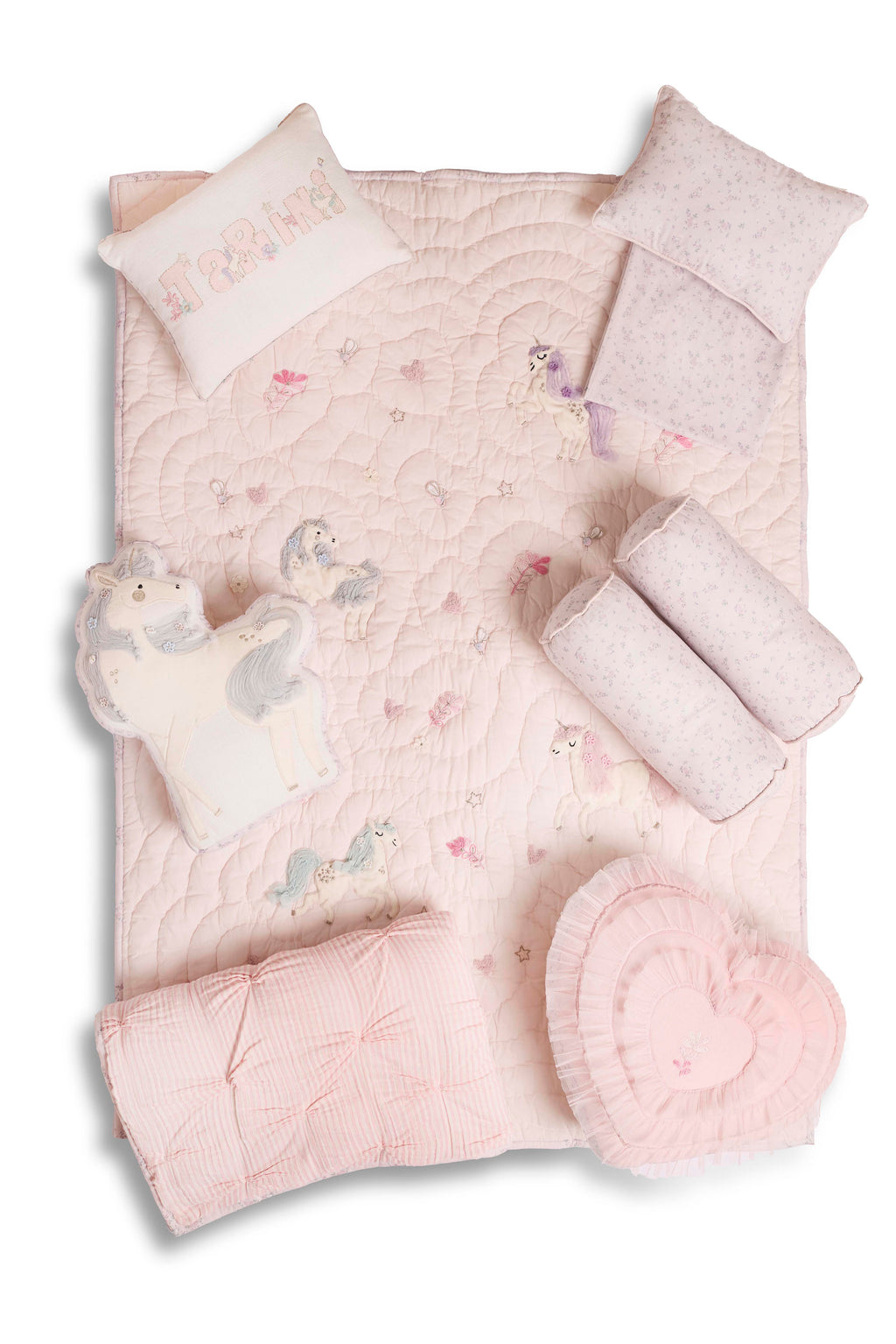 Crafted in light pastel tones with a soft flush of pink, the quilt combines plush velvet and pastel-textured fabrics to create an elaborate unicorn mane. Embellished with 3D flowers and shiny threads, each detail adds a layer of charm and texture.Delicately hand-quilted for a soft, luxurious feel, the quilt also features a beautiful floral trellis pattern quilted at the back, adding elegance to both sides. Made with a cotton base for comfort and breathability, it's ideal for snuggles, naps, or nursery décor.