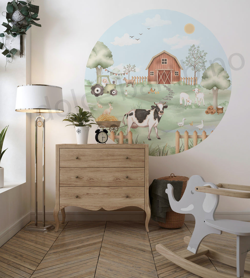 Farm Frenzy wallpaper Bubble is a serene, countryside escape brought to life with soft pastels and charming farm animals. The peaceful landscape features a delightful mix of animals grazing, playing, and resting near a classic red barn, evoking the tranquil beauty of rural life, perfect for creating a cozy, storybook feel in any child's room.