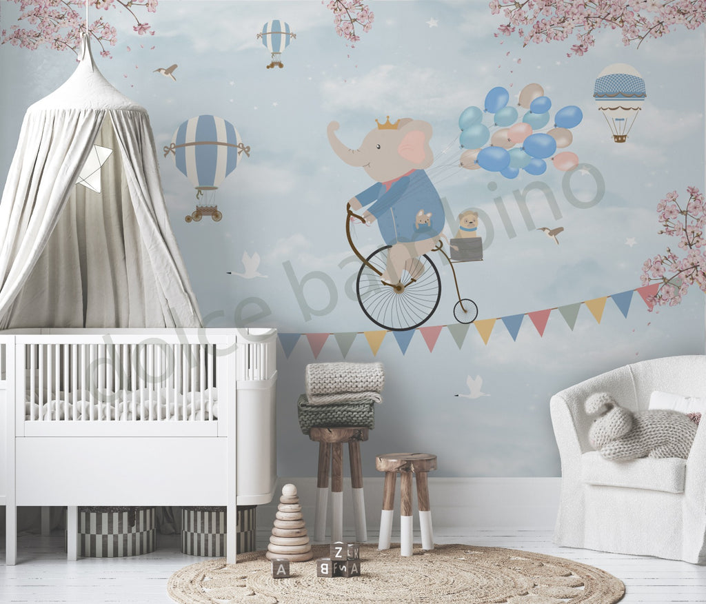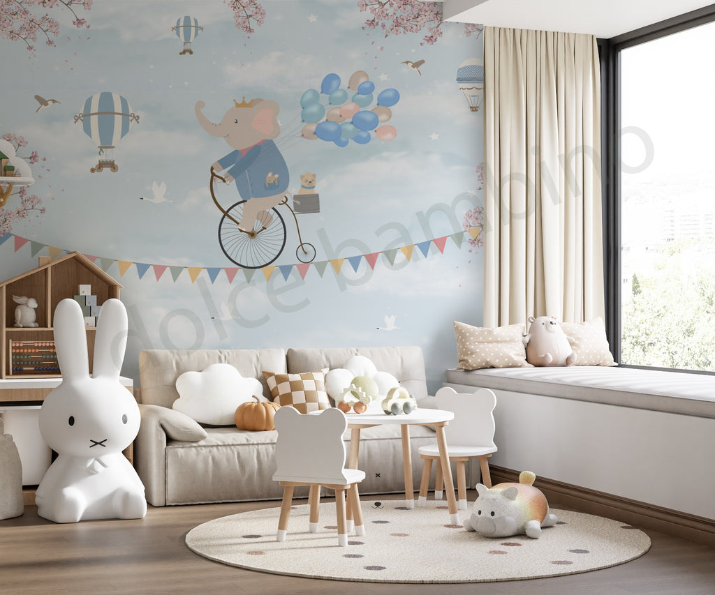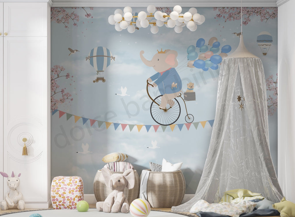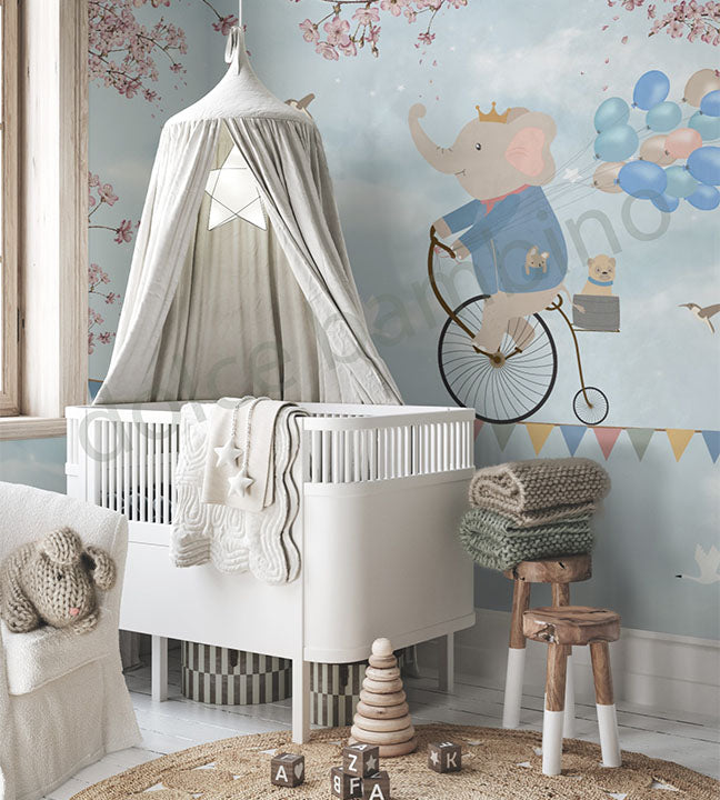 Transform your child’s room into a magical skyward adventure with this enchanting handpainted wallpaper. A charming elephant, donning a crown, pedals a vintage bicycle through a soft blue sky with floating balloons, and twinkling stars. Every detail is thoughtfully illustrated to evoke a sense of joy and wonder blending it perfectly balancing whimsy and elegance.
