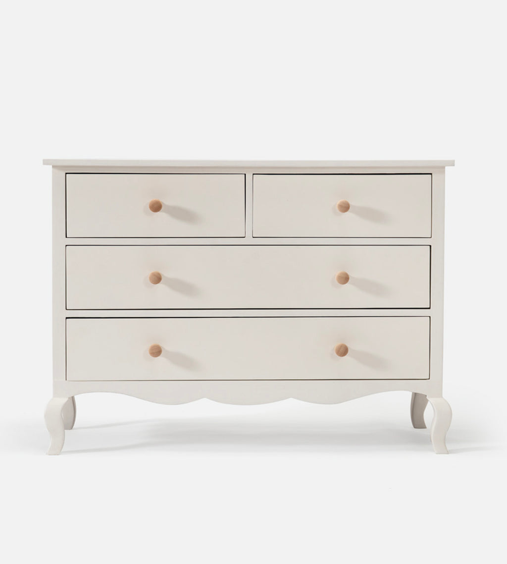 Graceful curves meet practical storage. Lulu’s scalloped apron and soft cabriole legs bring vintage charm to everyday function — perfect for nurseries and shared spaces alike.