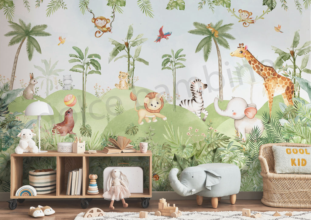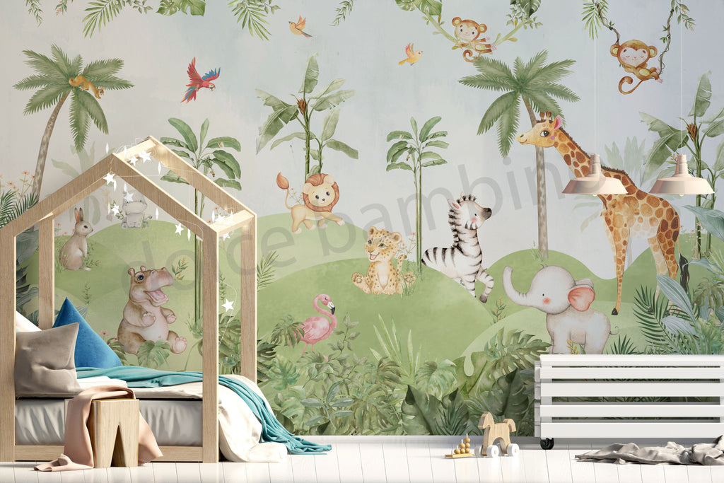 A gentle jungle story unfolds across the walls, with friendly animals, lush greenery, and soft, calming hues. Designed to feel playful yet serene, this wallpaper adds warmth and wonder to your child’s space, creating a room they’ll love growing up in.