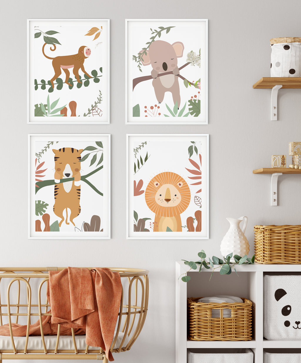 Turn your child’s space into a sweet safari retreat with this delightful collection of illustrated animal prints. From the curious monkey to the cosy koala, the thoughtful tiger, and the sunny little lion, each character brings its own charm to the room.