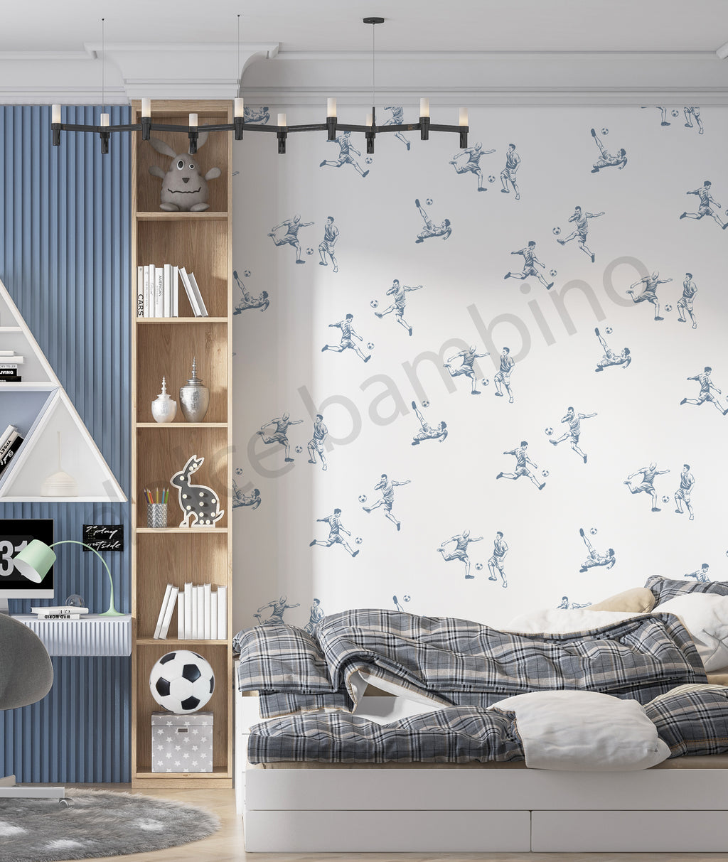 Drawn in soft monochrome tones, it blends sporty spirit with Scandinavian simplicity, making it perfect for little dreamers who love the game and big kids who never stop moving.  A space that feels inspiring, fresh, and full of quiet determination — where imaginations run free and every day feels like match day.