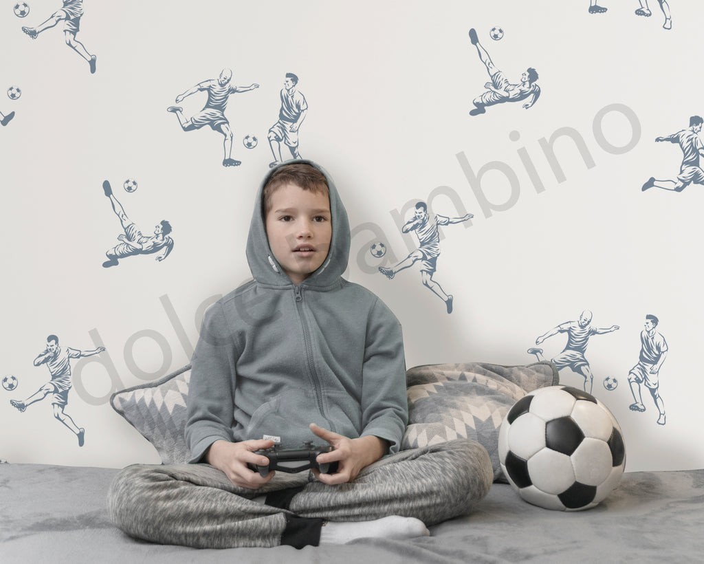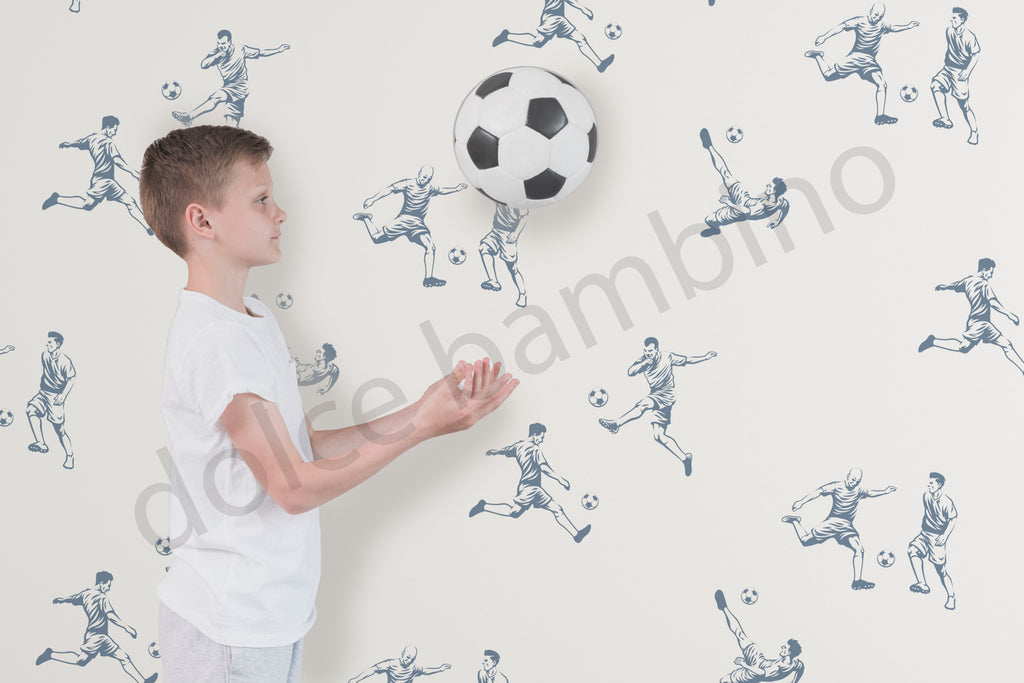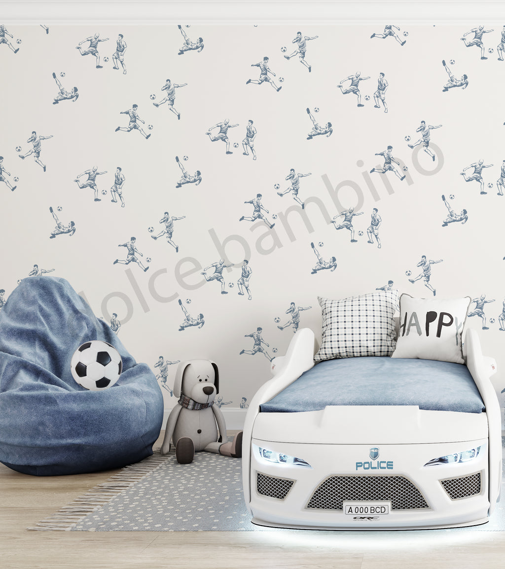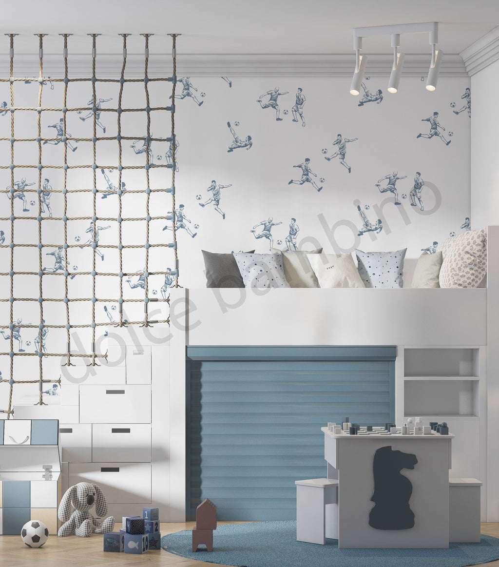 Energetic yet timeless, this hand-sketched wallpaper brings the thrill of football to life in a refined, playful way. Each illustrated figure captures a moment of movement — kicking, passing, chasing — creating a rhythm that feels lively without overwhelming the room.