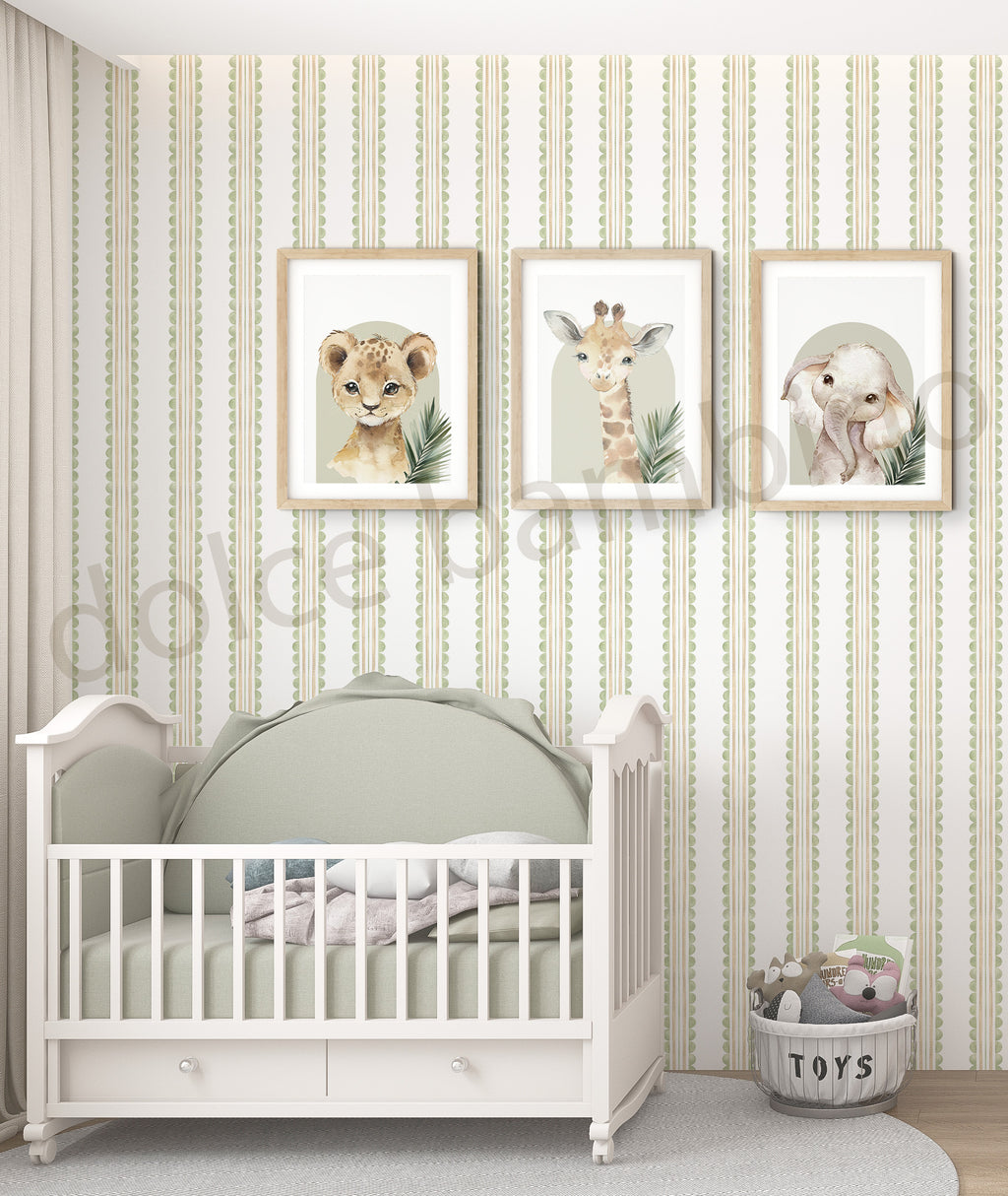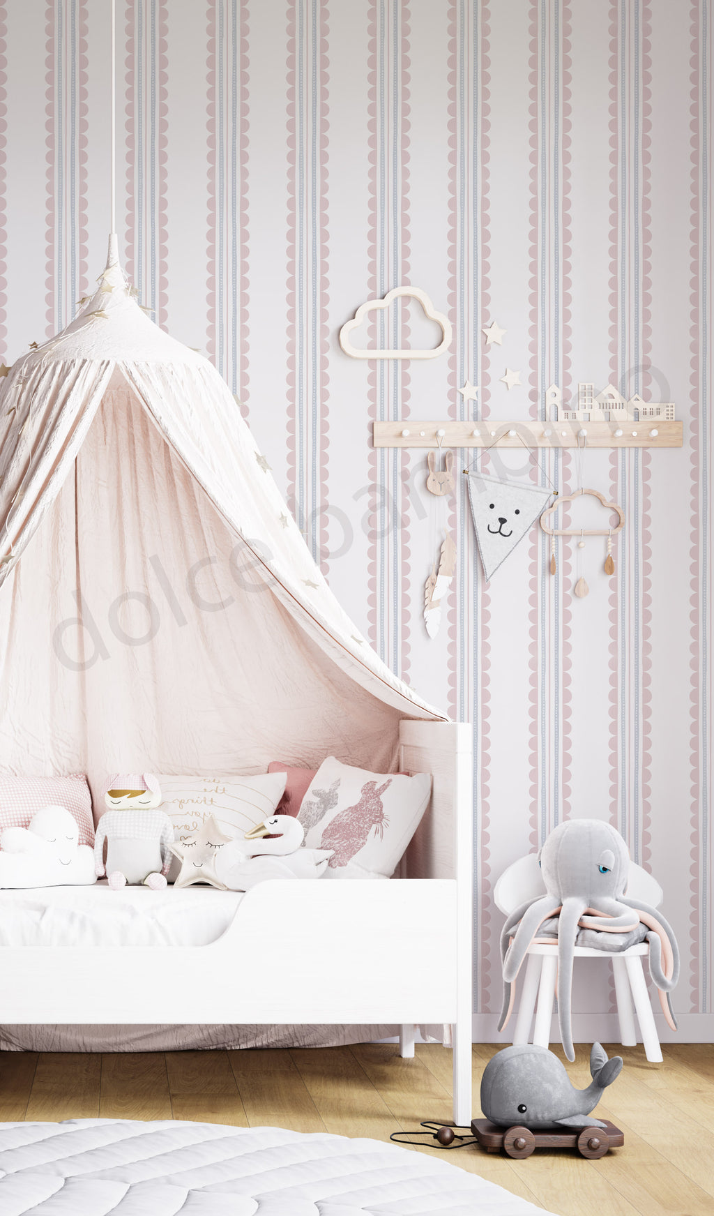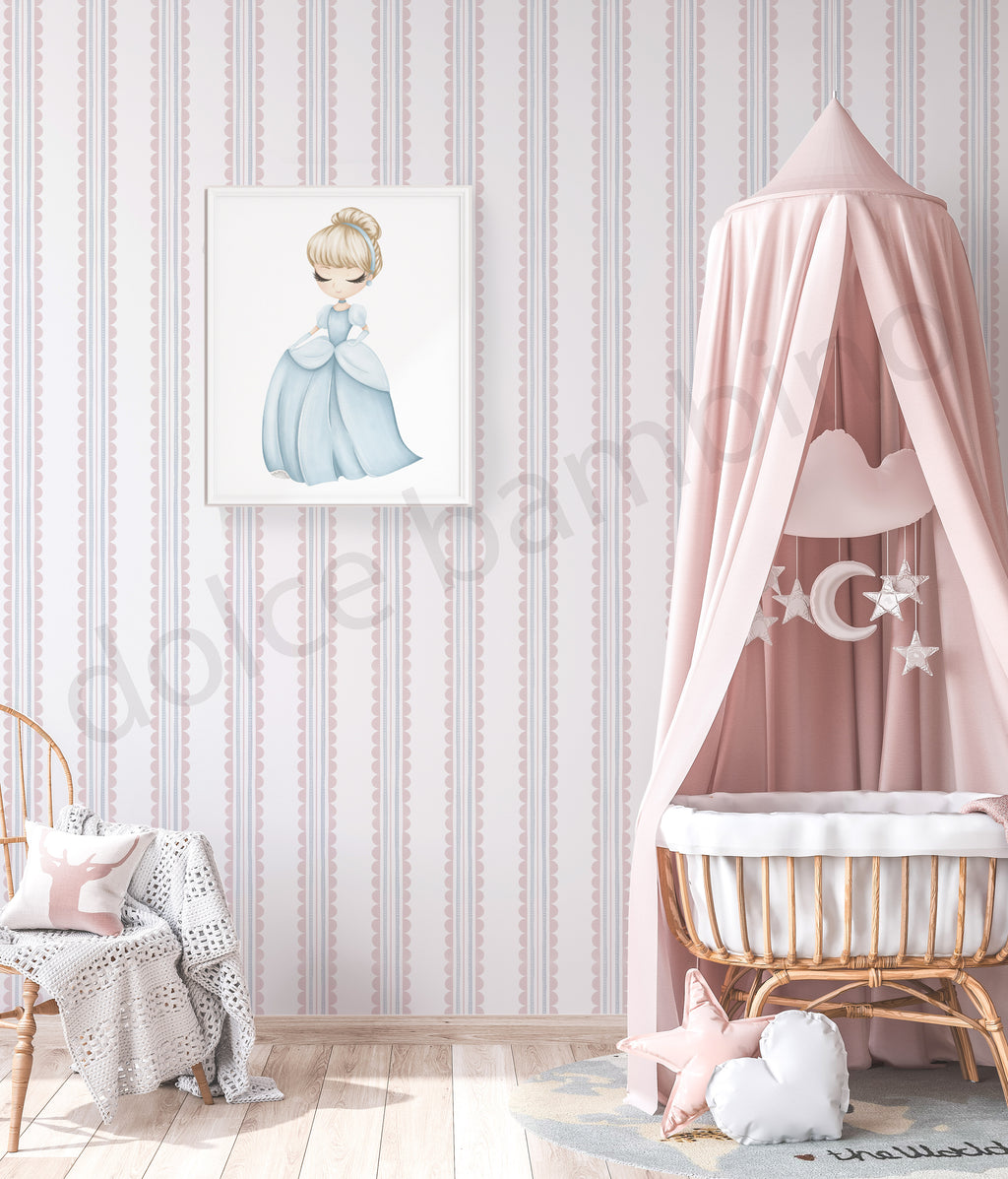 Gentle and timeless, this hand-painted wallpaper brings a calm charm to your child’s room, through its delicate scalloped stripes that blend playfulness and simplicity.