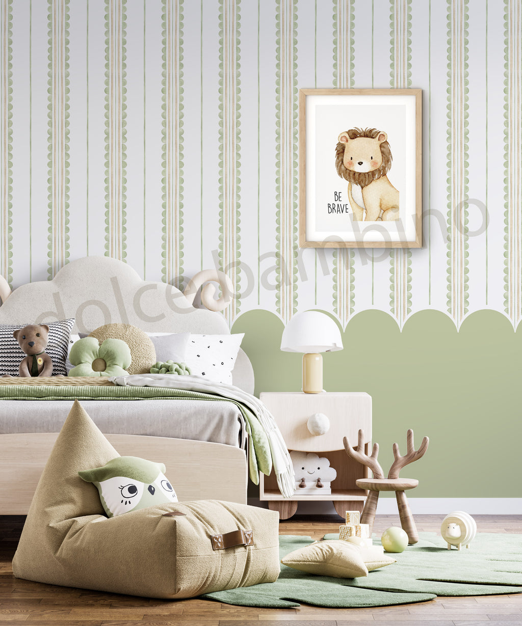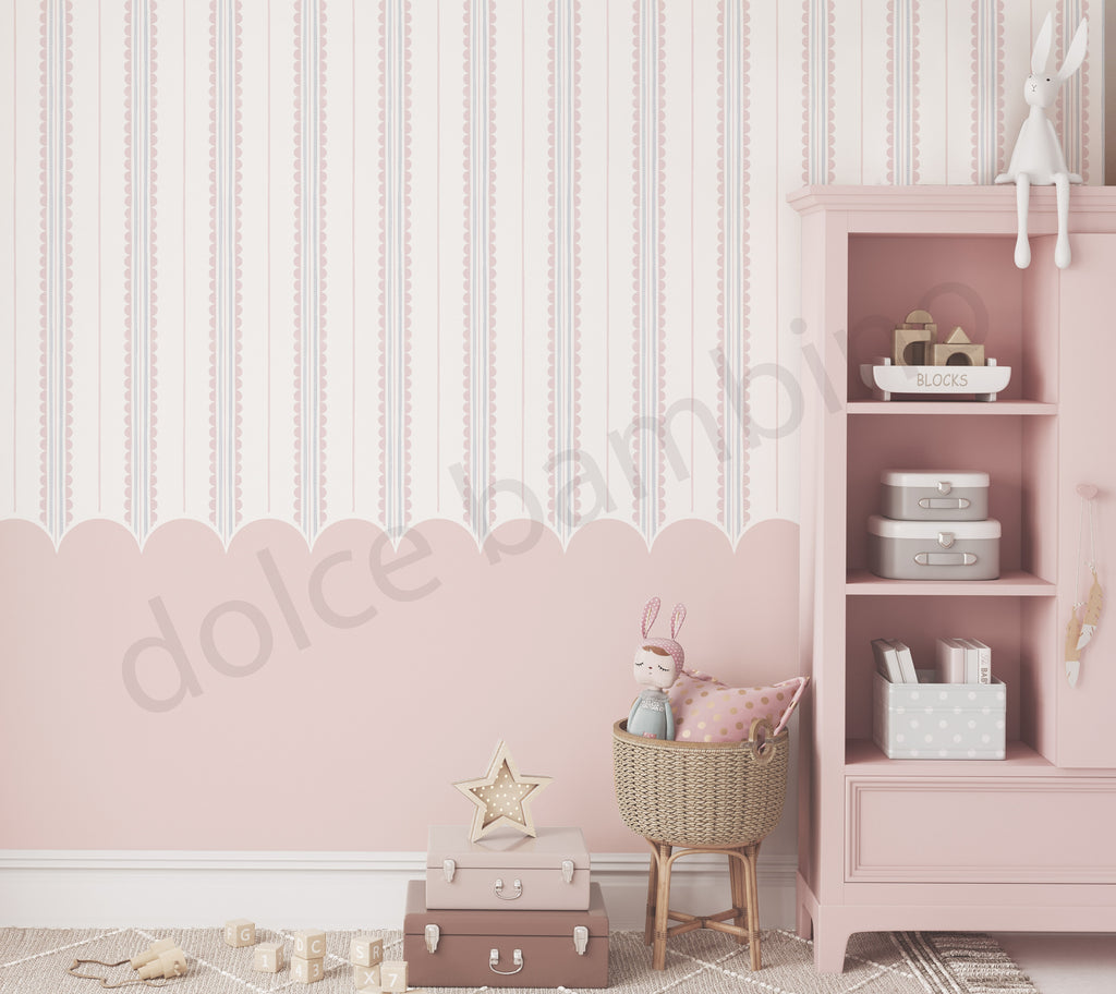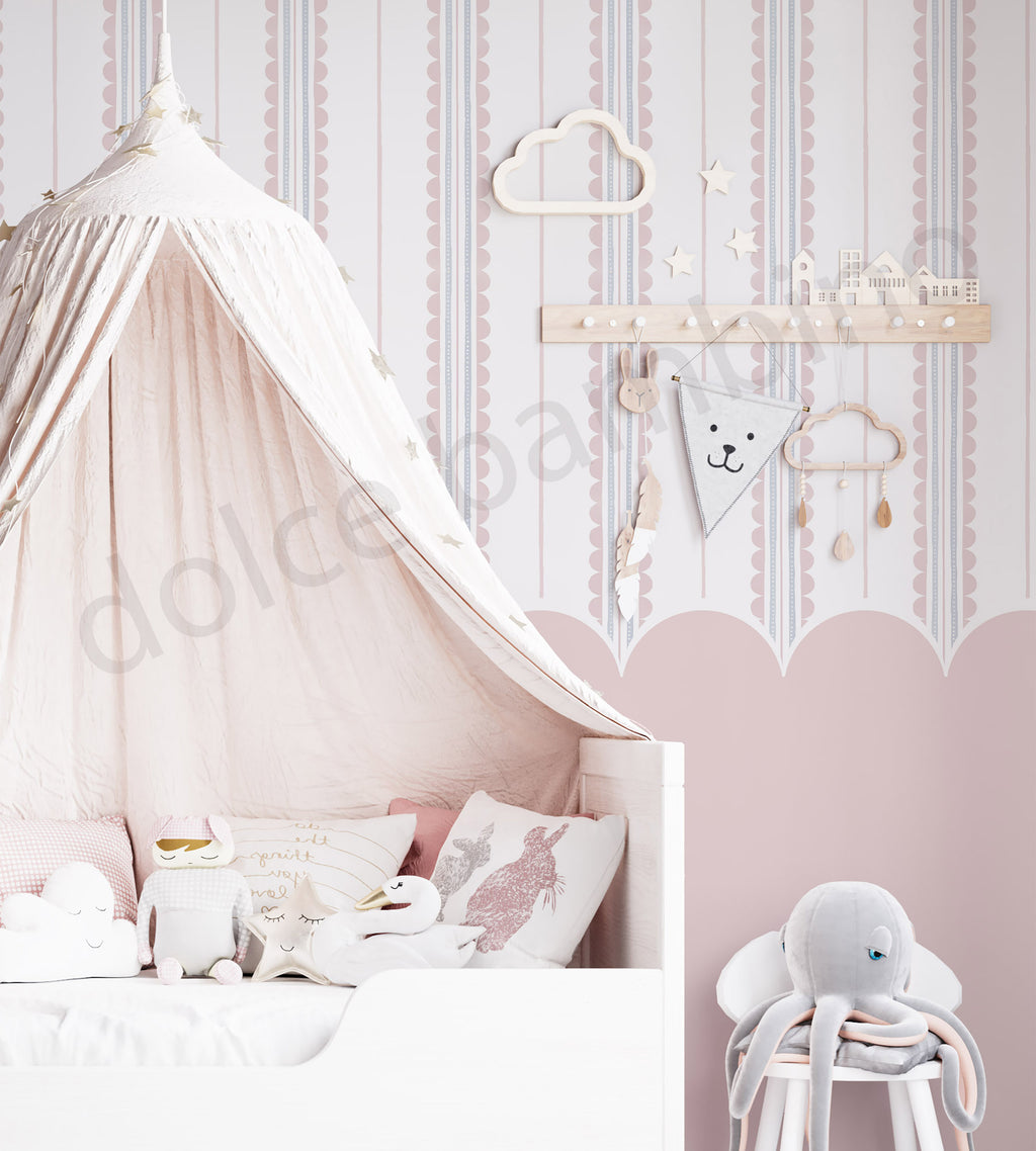 Gentle and timeless, this hand-painted wallpaper brings a calm charm to your child’s room, through its delicate scalloped stripes that blend playfulness and simplicity.