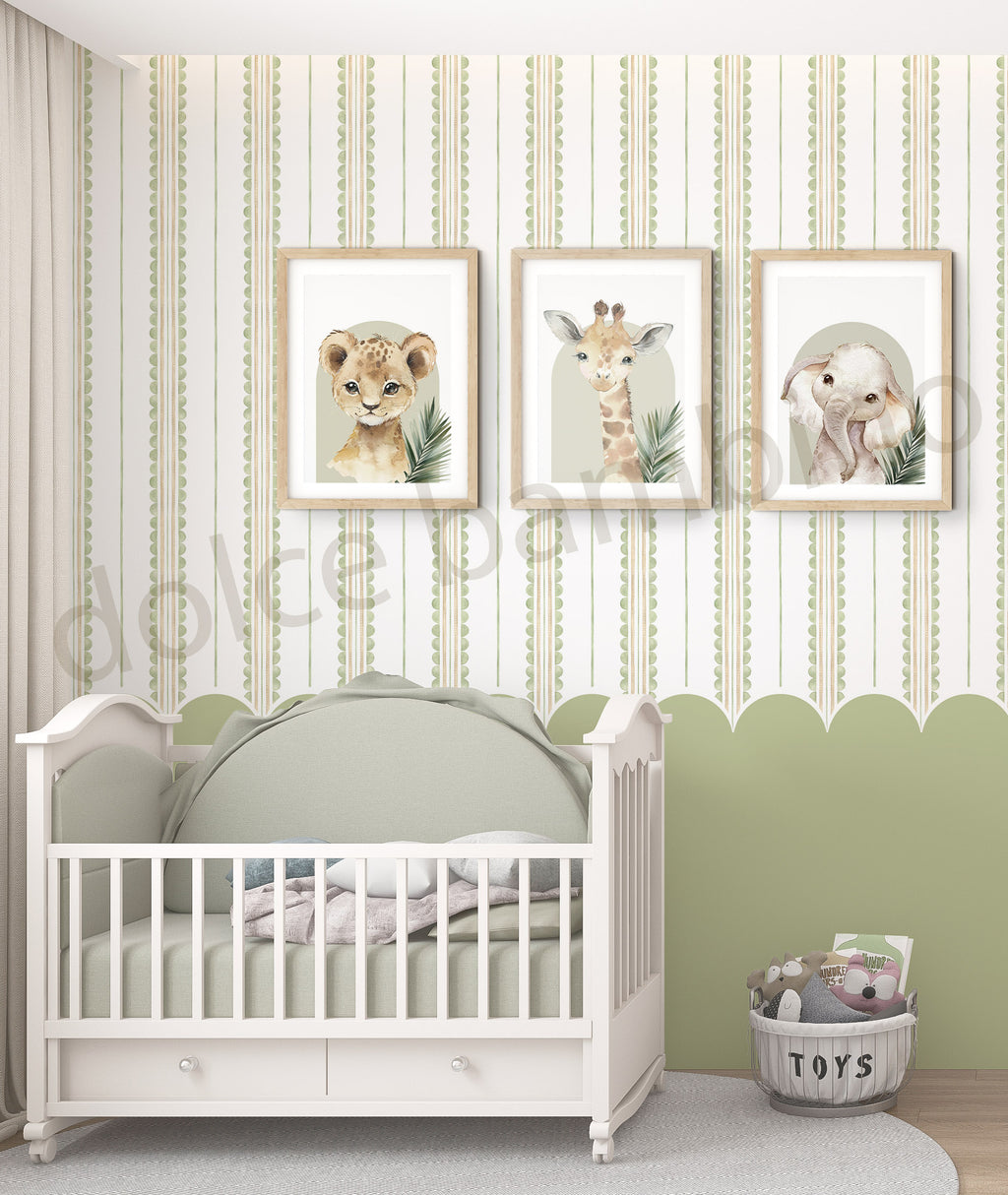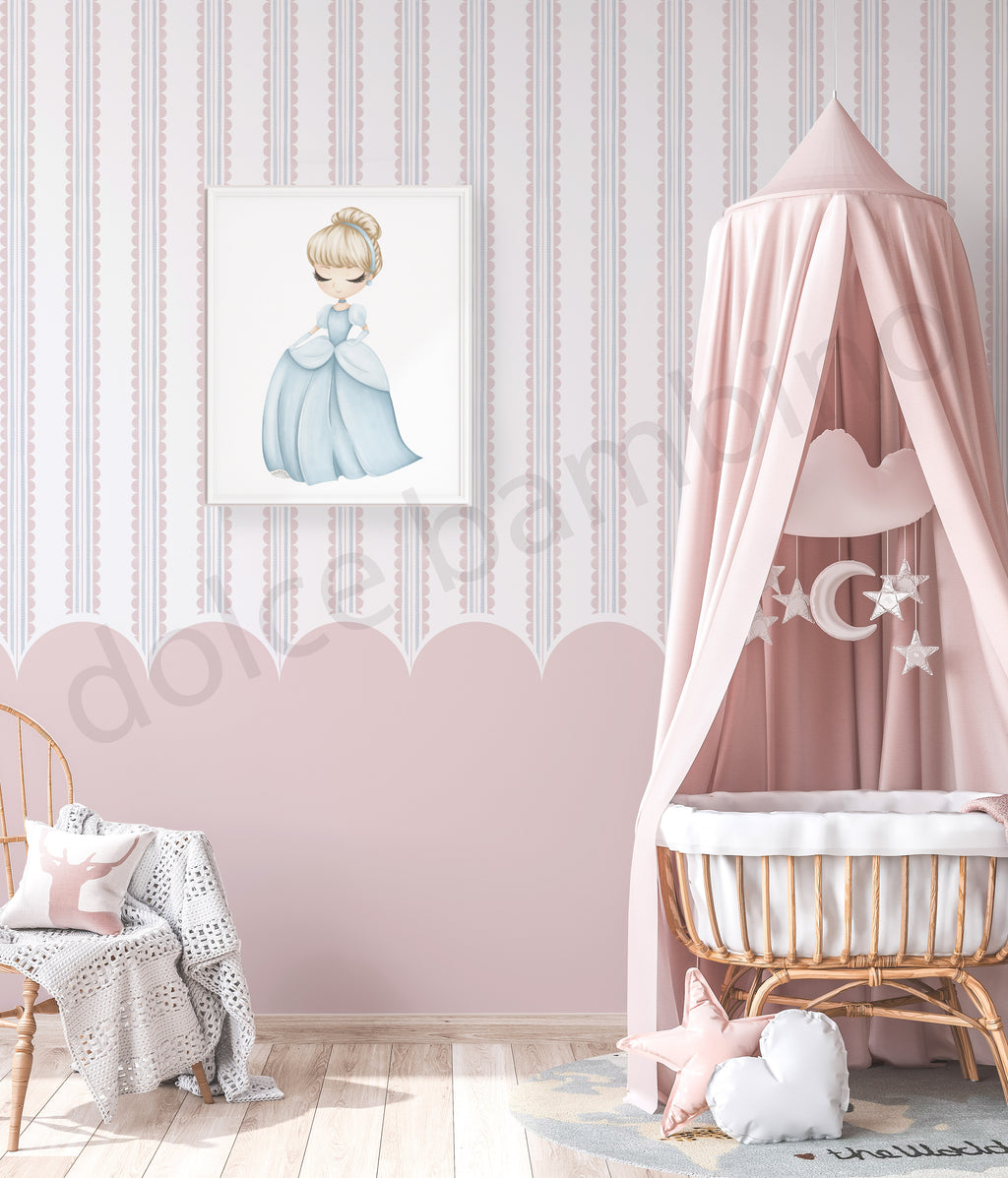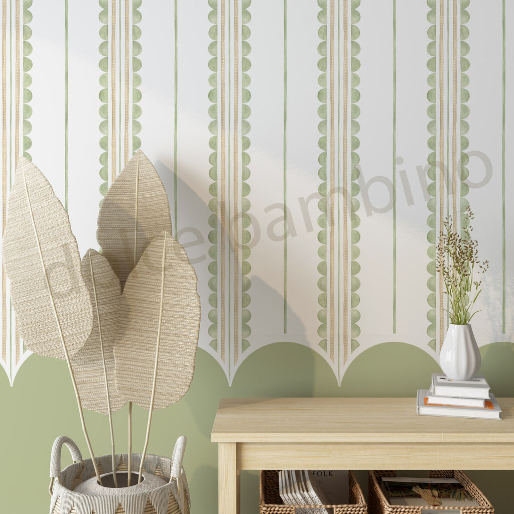 Gentle and timeless, this hand-painted wallpaper brings a calm charm to your child’s room, through its delicate scalloped stripes that blend playfulness and simplicity.