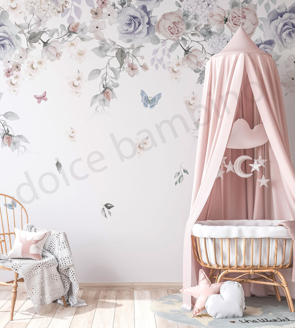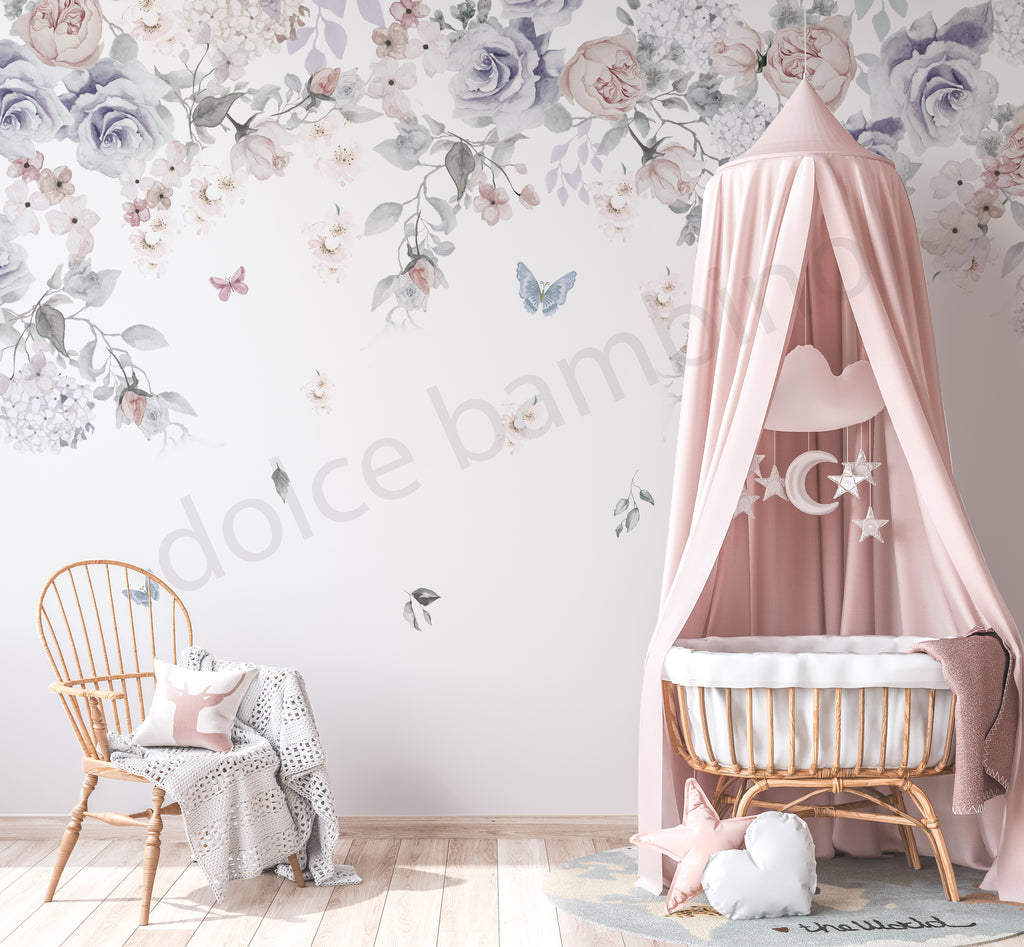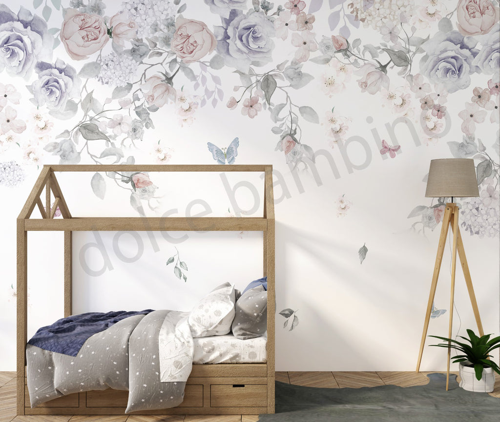 Transform your child’s room into a serene floral sanctuary with this exquisitely handpainted wallpaper. Soft pastel roses, delicate hydrangeas, and graceful trailing foliage create an enchanting overhead garden, while gentle butterflies flutter playfully, adding a touch of magic. Every detail is thoughtfully illustrated to evoke a sense of calm, wonder, and timeless elegance, striking the perfect balance between sophistication and whimsy.