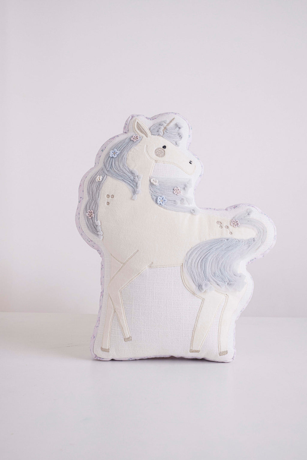 Add a magical touch to your little one’s space with our Unicorn Fantasy Cushion, featuring an intricate patchwork of soft velvet and shimmering metallic threads. The unicorn's mane is artfully designed with layered textured fabrics, each stitched with shiny thread and adorned with delicate 3D flowers for a dreamy, tactile finish.